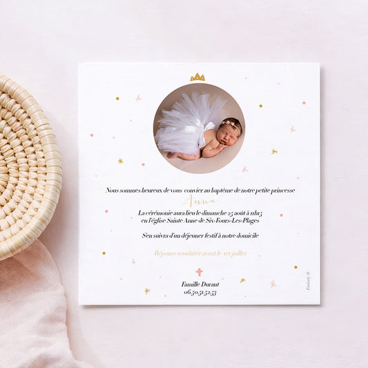 Faire-part de baptême princesse – Carrosse rose « Comme un conte de fées »