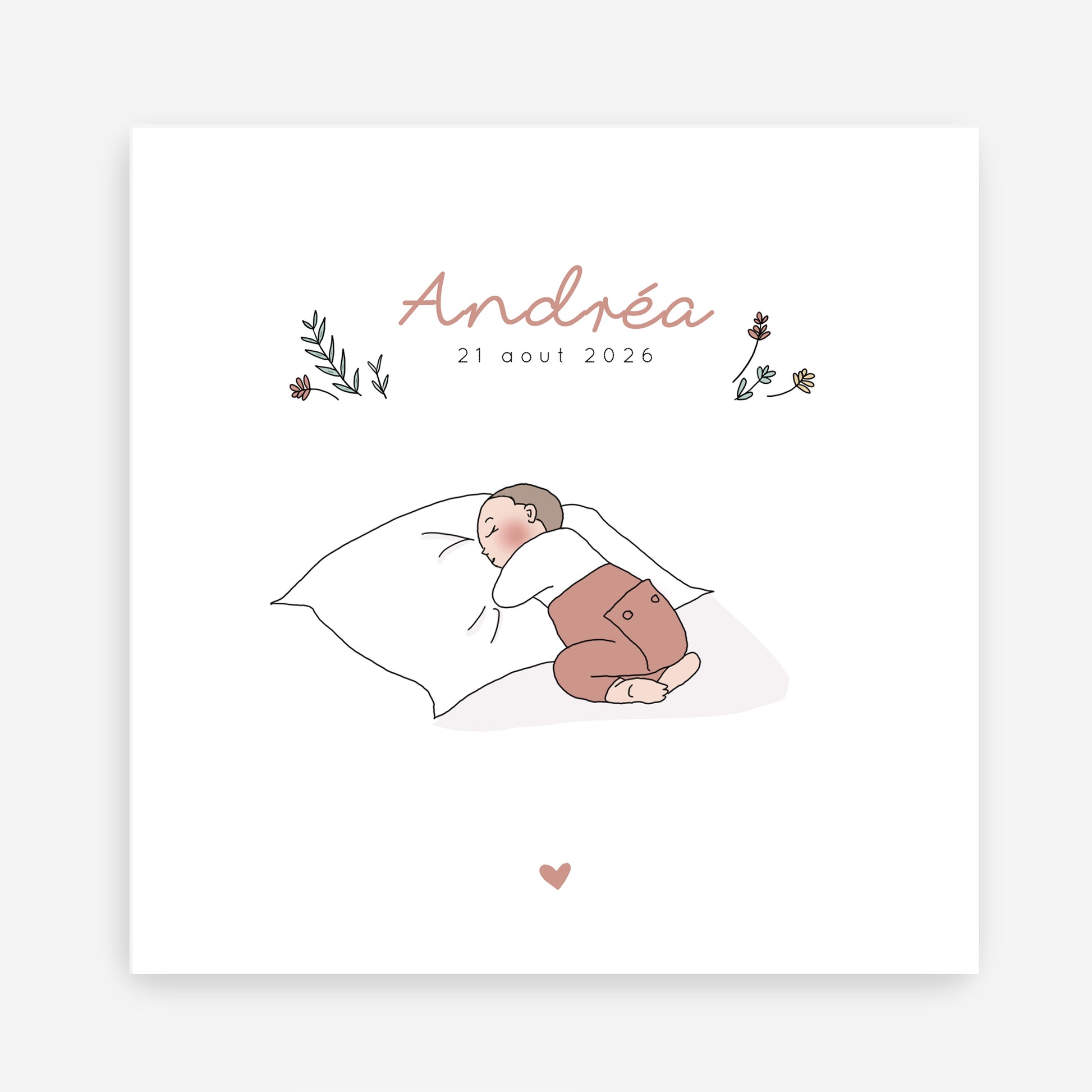 Illustré d’un bébé endormi sur un oreiller, ce modèle respire la tendresse et la poésie.